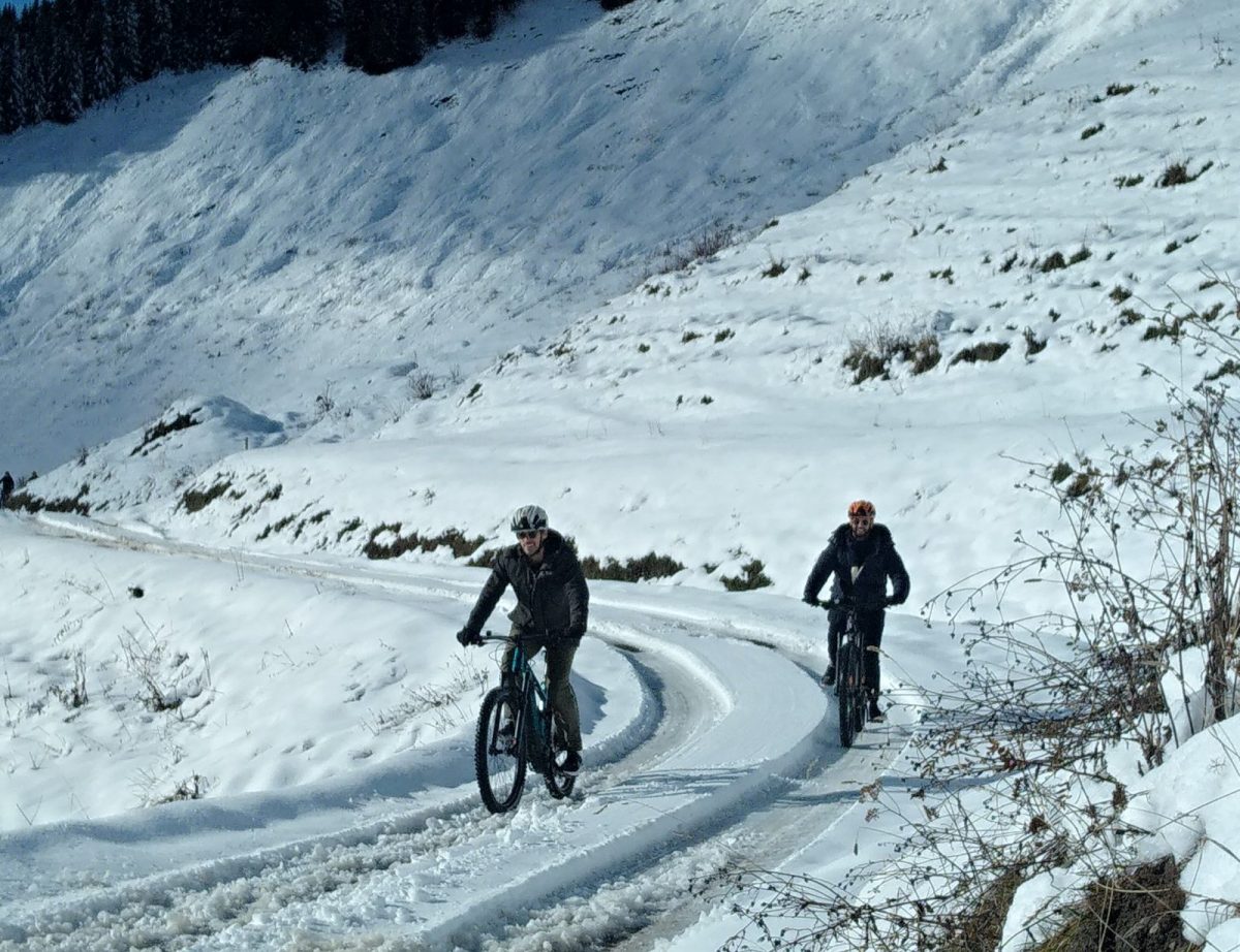 VTT Electrique sur neige au Grand-Bornand : découvrez les sensations du vélo sur neige avec nos VTTAE (27.5+ ou 29" 2.60) aux pneus sous gonflés. Partez à la découverte du fond de la vallée du Bouchet et faites le plein de sensations !