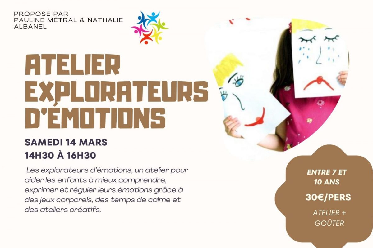 Les explorateurs d'émotions, un atelier pour aider les enfants à mieux comprendre, exprimer et réguler leurs émotions grâce à des jeux corporels, des temps de calme et des ateliers créatifs.