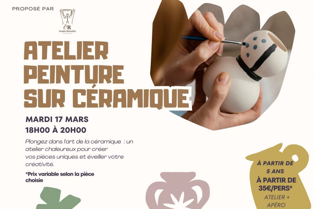 À propos Tarifs Informations de contact Retour à la liste Mardi 17 mars 2026 de 18h à 20h. Plongez dans l'art de la céramique : un atelier chaleureux pour créer vos pièces uniques et éveiller votre créativité. Tarifs Plein tarif : à partir de 35 € (Prix variable selon la pièce choisie).