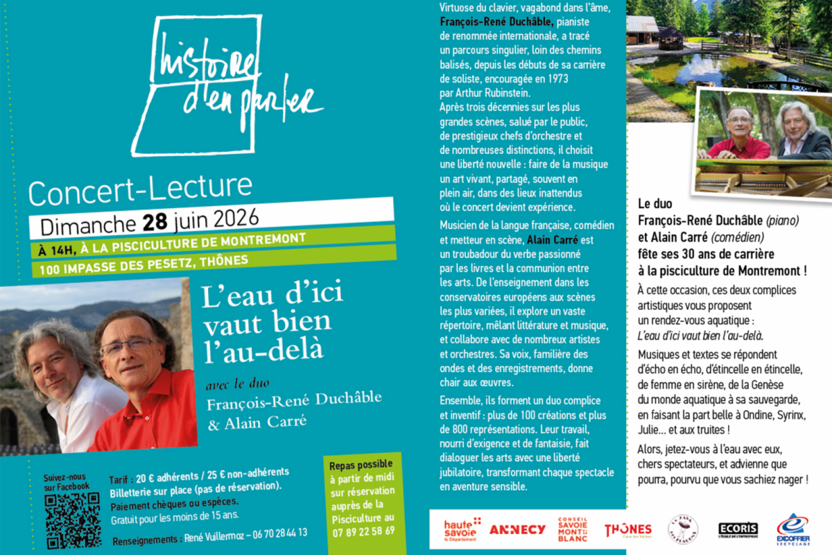 Le duo François-René Duchâble (piano) et Alain Carré (comédien) fête ses 30 ans de carrière. A cette occasion, ces deux complices artistiques vous proposent un rendez-vous aquatique. Musiques et textes se répondent d'écho en écho, d'étincelle en étincelle