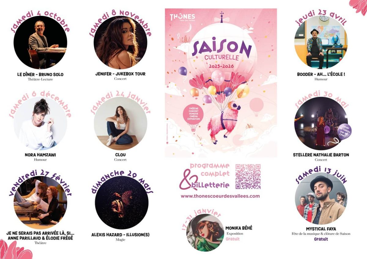 C’est avec une immense joie que nous vous invitons à la 8ème édition de la Saison Culturelle de Thônes ! Après une saison précédente couronnée de succès, qui a affiché complet sur plus de la moitié des spectacles, nous tenons à vous remercier pour votre engouement, votre confiance et votre fidélité.